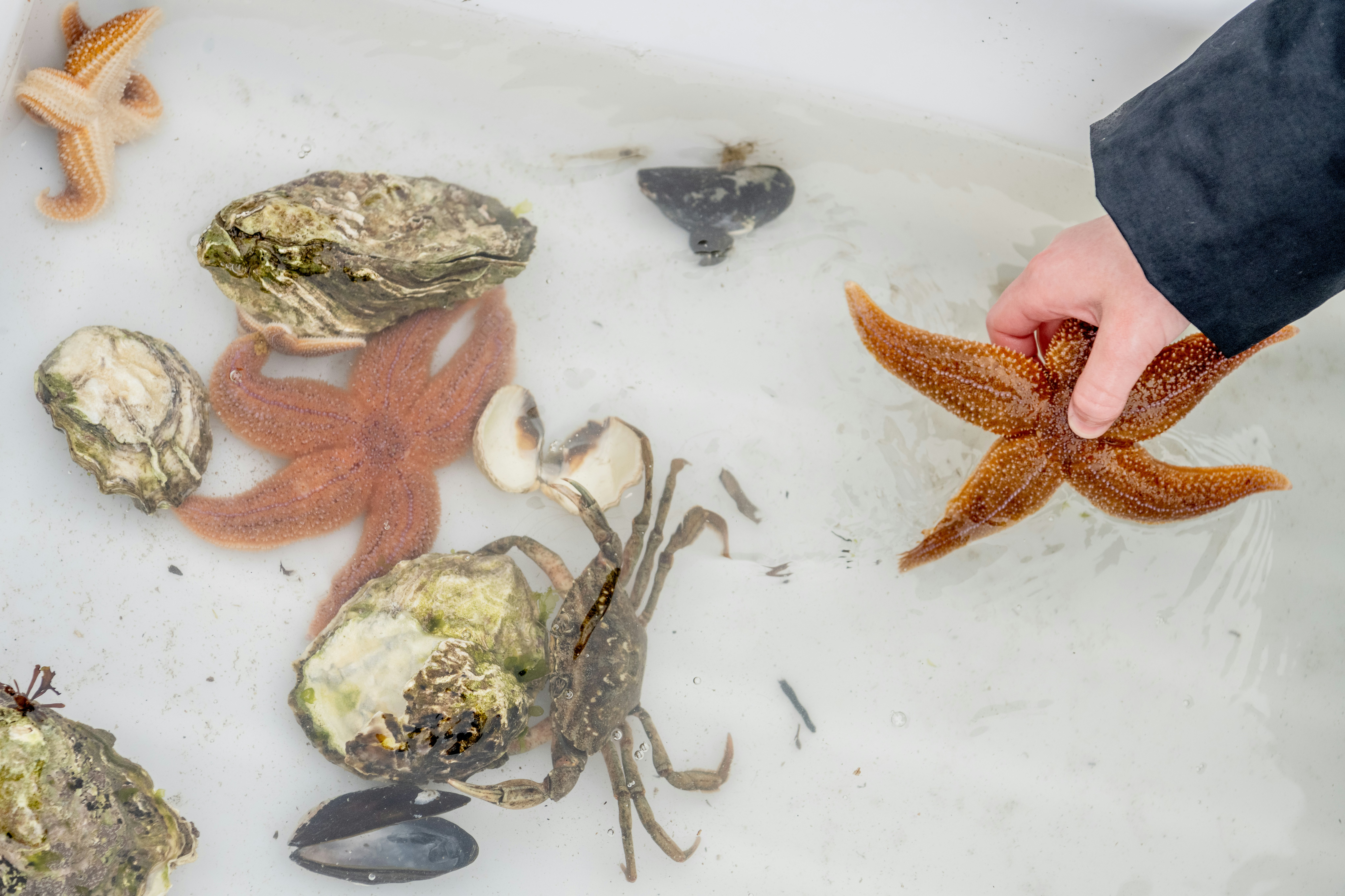 De fleste dyr kan gå længe uden mad. Muslinger kan eksempelvis leve af den naturlige algevækst i akvariet. Hvis du har krabber, kan du knuse et par muslinger en til tre gange om ugen, afhængigt af temperaturen. Jo varmere vandet er, jo mere aktive er dyrene, og derfor har de også behov for mere mad.