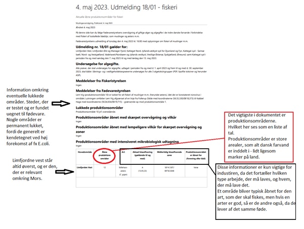 På fødevarestyrelsens hjemmeside ses de områder, der er åbne for muslingefiskeri, og som dermed er testet for giftige alger eller bakterier. Der er typisk tre udmeldinger: høst, fiskeri og vandindtag, og der kommer en ny udmelding fredag eftermiddag.